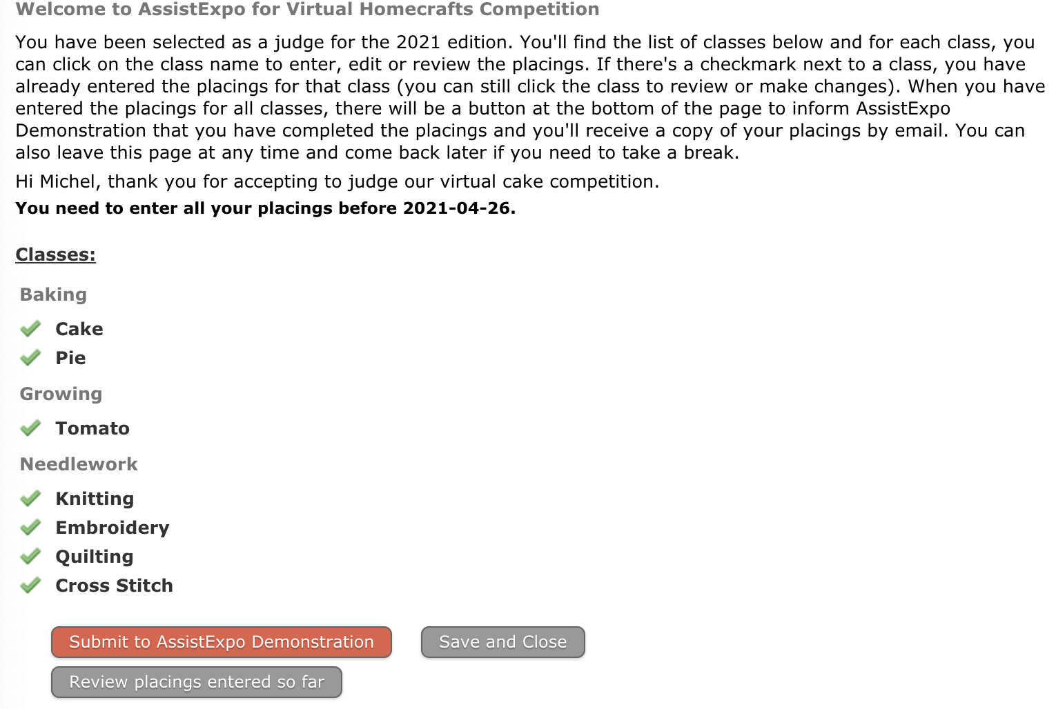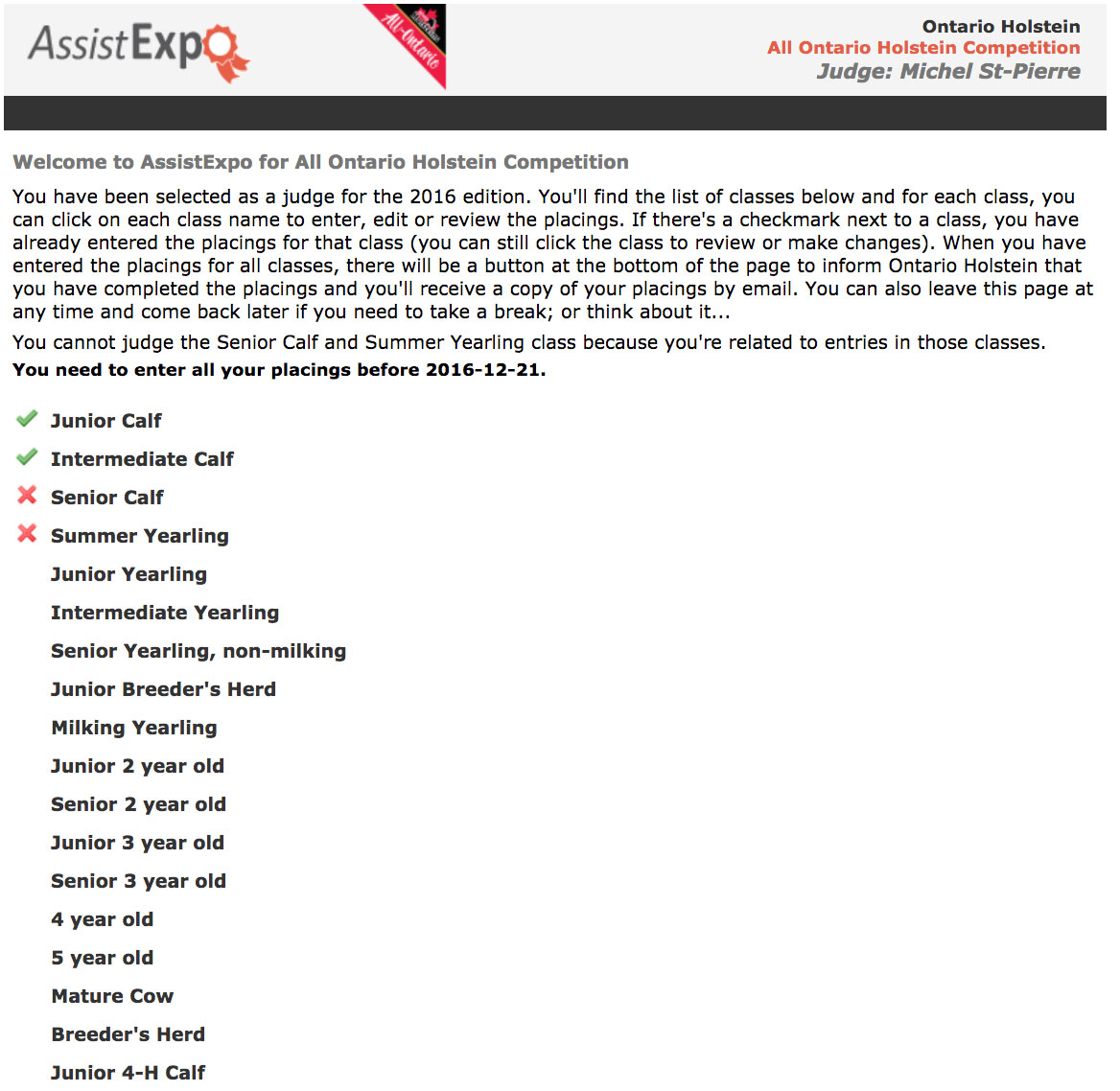 AssistExpo provides true "online judging", unlike other systems that force the judges to vote in a PDF or Excel file sent by email, along with a huge PDF file showing all entries. Unlike some other systems made for generic virtual shows, AssistExpo knows about livestock shows and other agricultural shows; AssistExpo knows a dairy calf, a sheep, field crops and flower arrangements are not judged the same way. The online judging screen can be configured for each specific show.AssistExpo brings true online judging. All you need to send the judges is a link to the page where they can judge online; no need to send them heavy documents. When they open the link, they get detailed instructions, they can see the classes, the entries in each class, and they can enter their placings directly. All feedback is positive; people did not think it could be made to be so easy and intuitive.