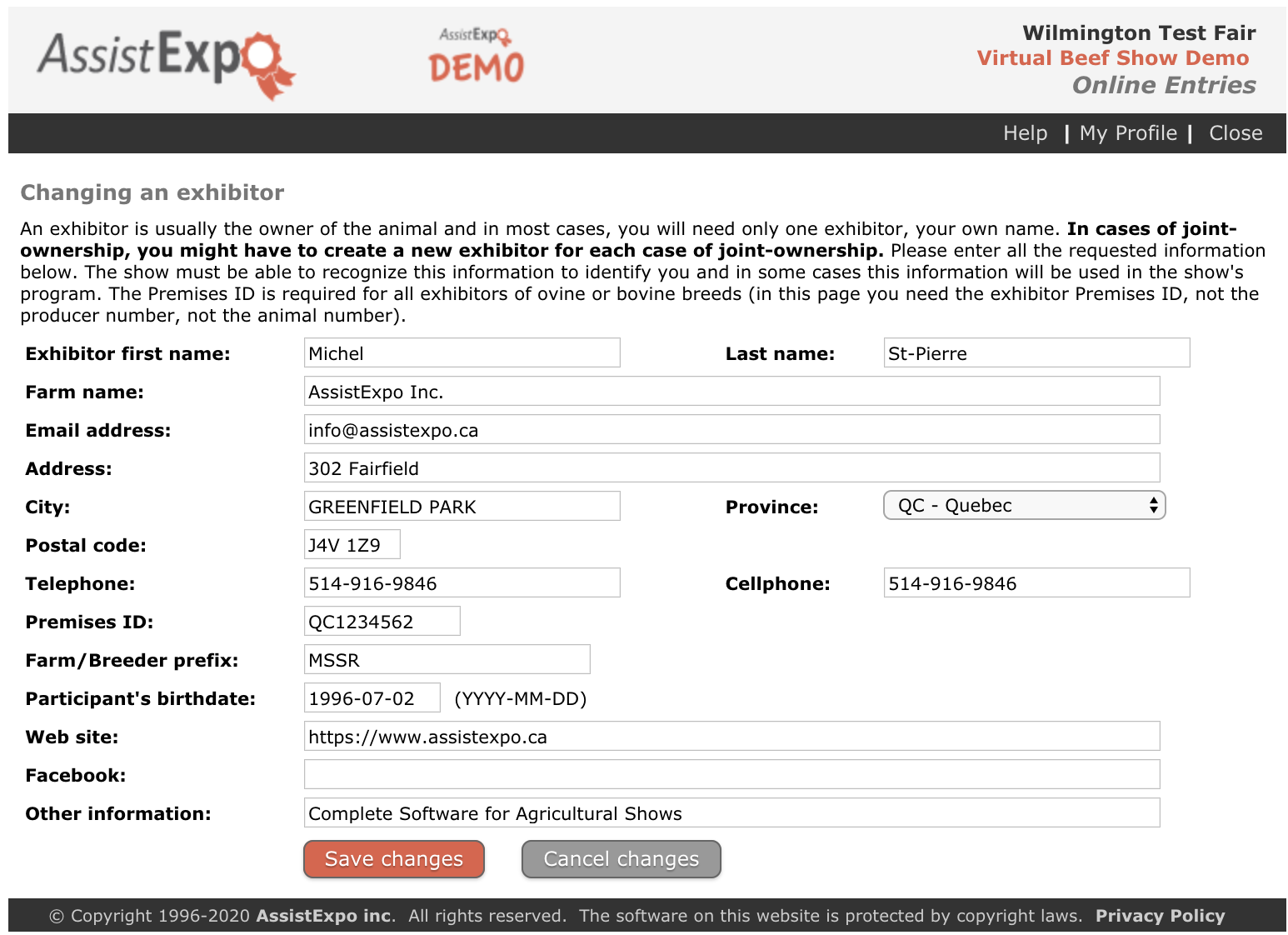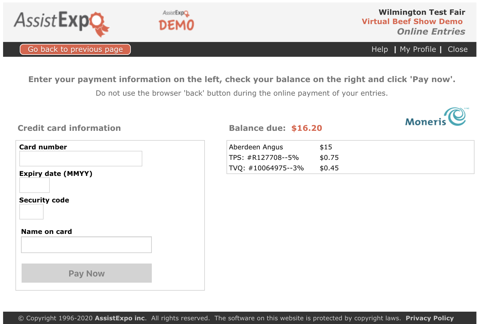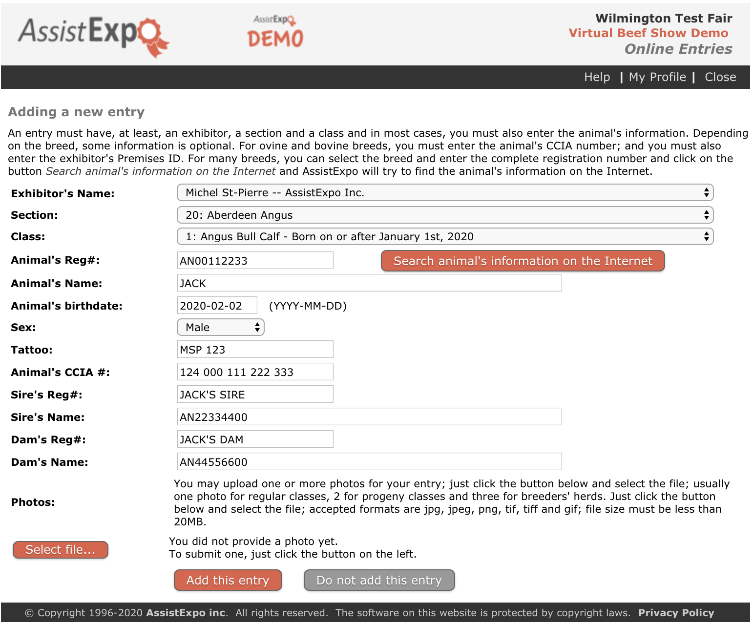 The online entries system allows your breeders or exhibitors to enter online. For them it's really easy because they've already been using the system for many years. AssistExpo knows about livestock and the entries are connected to most breed registries to make sure the data is accurate. The online entry form has a button to select media files to be uploaded with the entry. If entry fees are applicable, the exhibitors can pay online with a credit card.