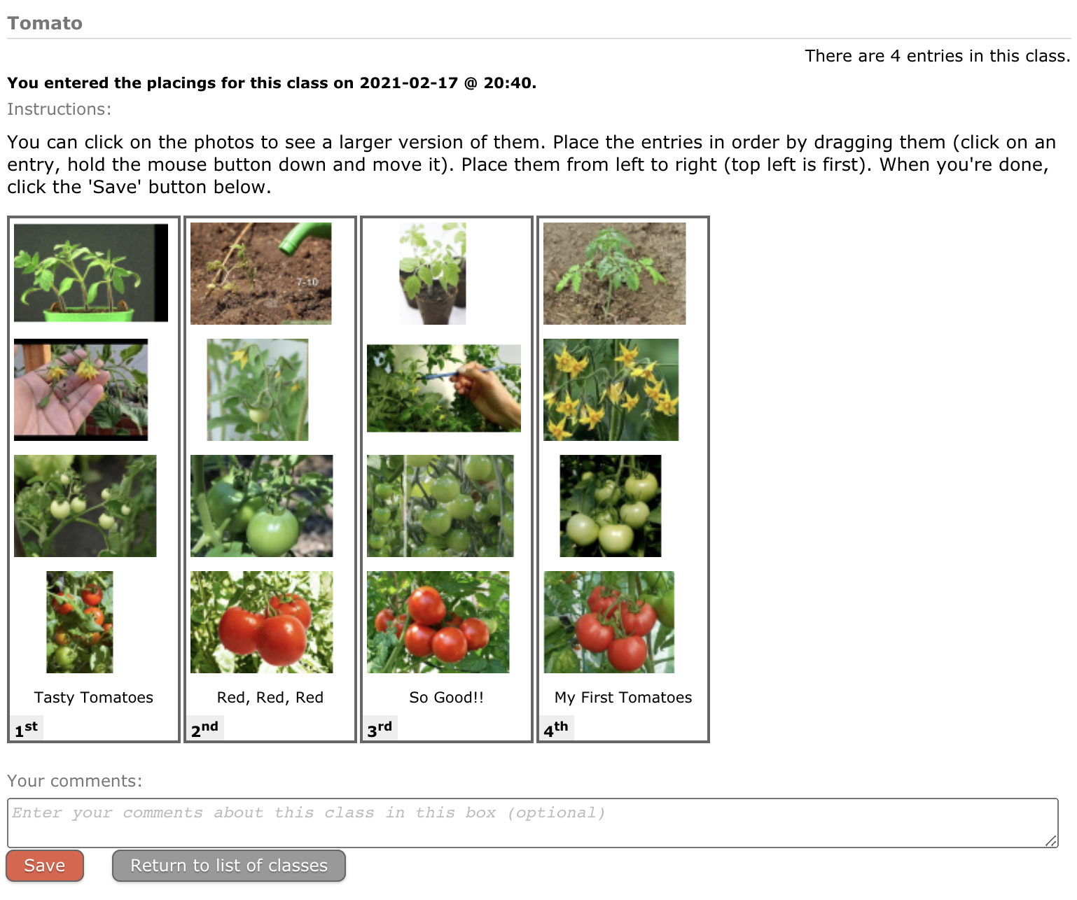 Judges can click a photo to see details of an entry. Level of details visible by the judge is configurable.