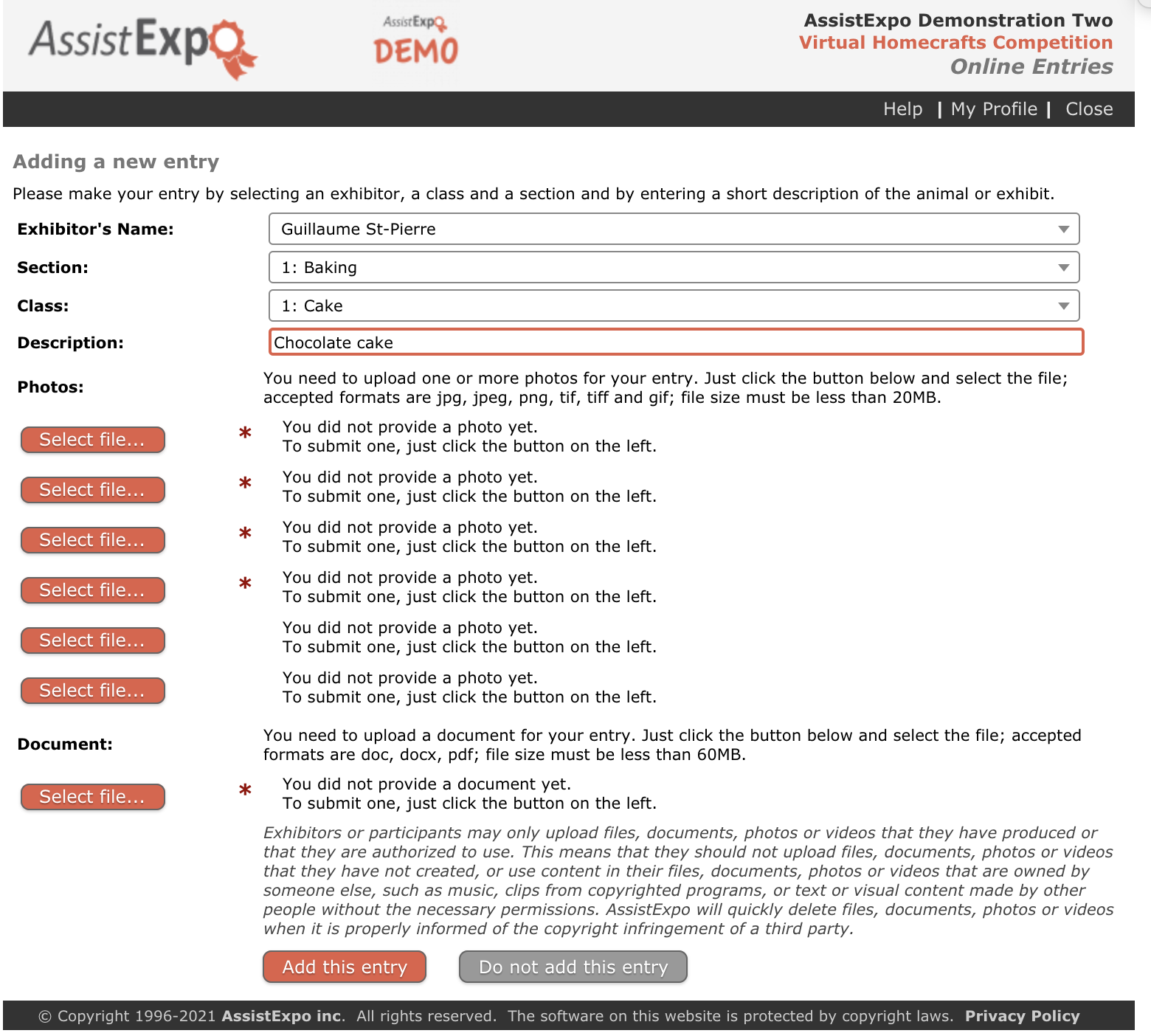 Here's a sample entry form for a baking entry where the show decided to request a minimum of 4 photos and up to 6 allowed and also require a document with each entry. The document is typically used to upload the recipe; or in other classes, in can be used for poems or other written creations.